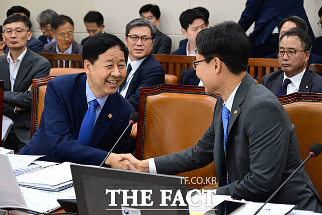 [더팩트ㅣ국회=남윤호 기자] 구윤철 경제부총리 겸 기획재정부 장관이 19일 오전 서울 여의도 국회에서 열린 기획재정위원회 전체회의에 출석해 임광현 국세청장과 인사하고 있다.