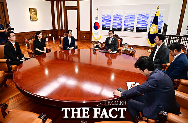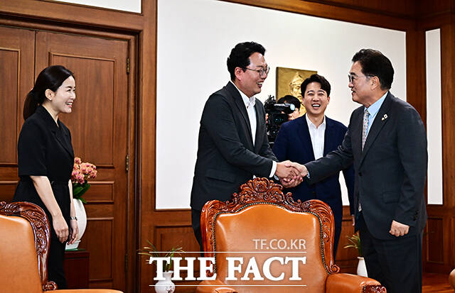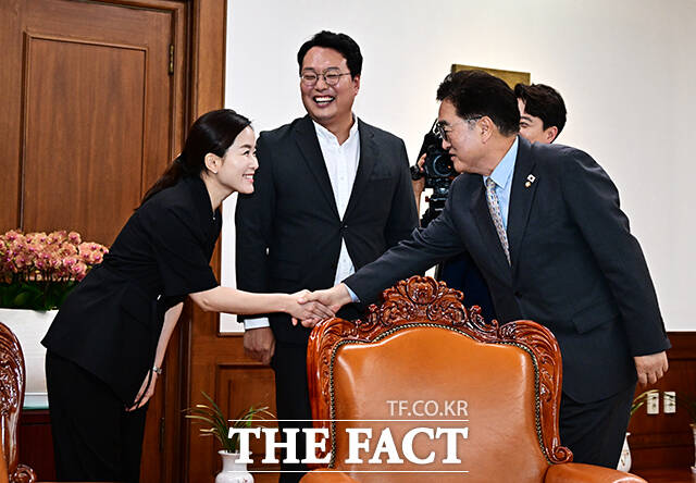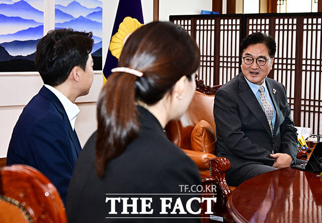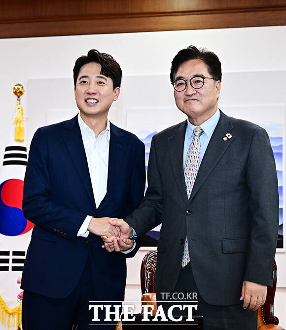 [더팩트ㅣ국회=배정한 기자] 우원식 국회의장이 19일 오후 서울 여의도 국회에서 이준석 개혁신당 대표(왼쪽)를 접견하며 기념사진 촬영을 하고 있다.