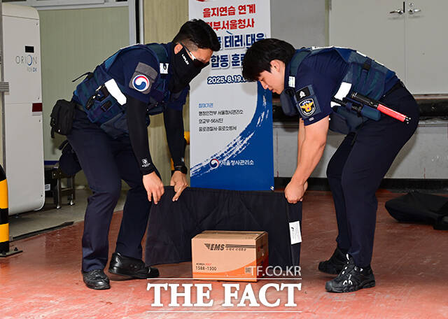 [더팩트ㅣ임영무 기자] 정부서울청사 폭발물 테러 대응 합동훈련이 19일 오후 서울 종로구 정부서울청사 별관 화물하역장에서 실시된 가운데 경찰이 택배 폭발물 의심 박스에 방폭 담요를 설치하고 있다.