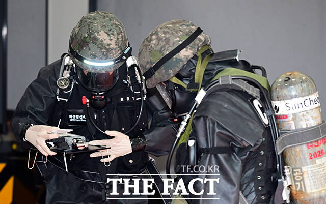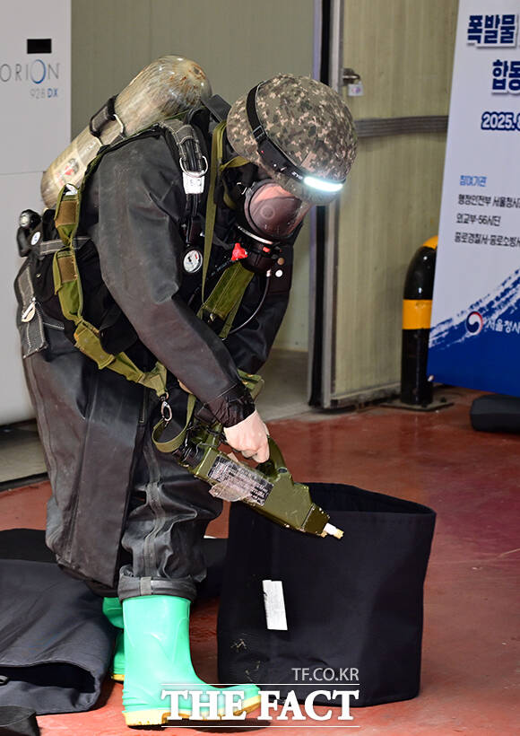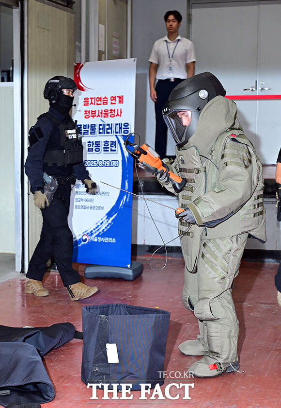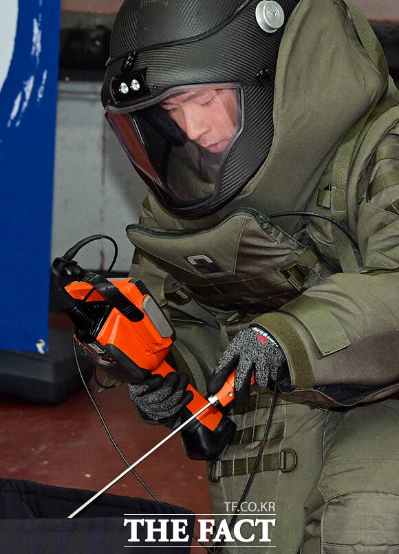 [더팩트ㅣ임영무 기자] 정부서울청사 폭발물 테러 대응 합동훈련이 19일 오후 서울 종로구 정부서울청사 별관 화물하역장에서 실시된 가운데 폭발물 처리반(EOD) 대원이 택배 폭발물을 확인하고 있다.
