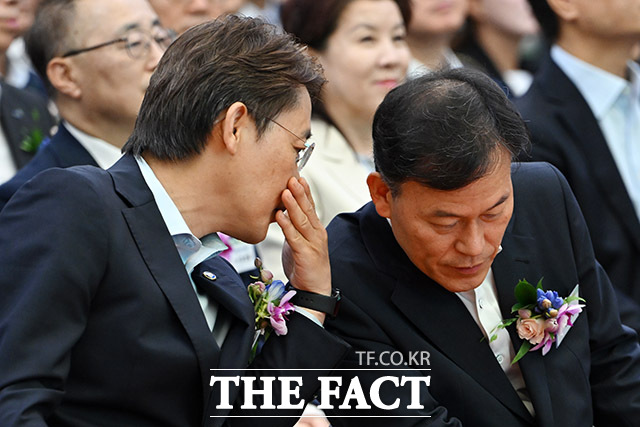 [더팩트ㅣ남용희 기자] 2025 금융권 공동채용 박람회 개막식이 20일 오전 서울 중구 동대문디자인플라자(DDP)에서 열린 가운데 윤한홍 국회 정무위원회 위원장(오른쪽)과 권대영 금융위원회 부위원장이 대화를 나누고 있다.