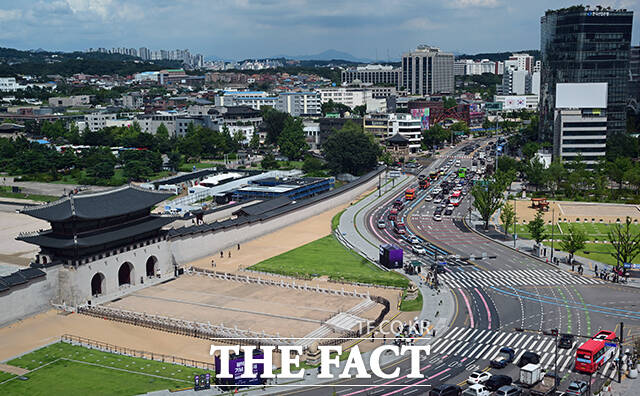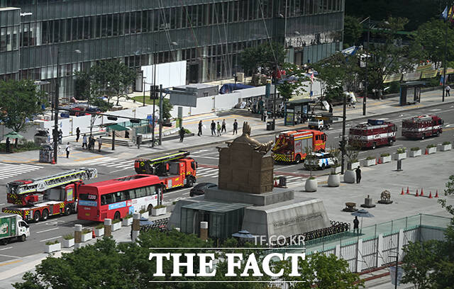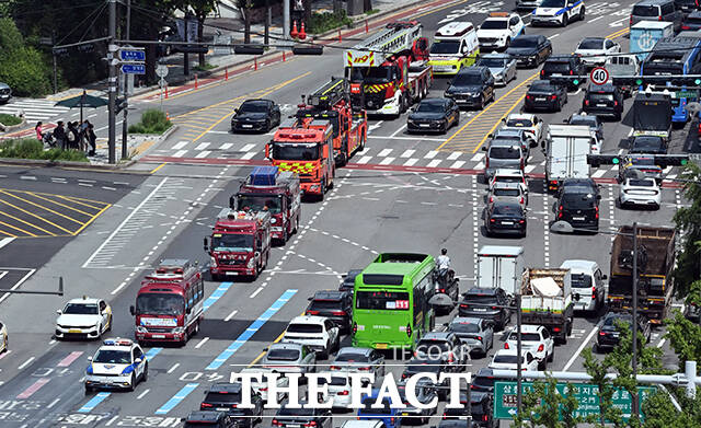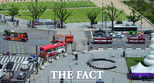 [더팩트ㅣ임영무 기자] 을지연습과 연계한 전국 동시 민방위 훈련이 실시된 20일 오후 서울 종로구 광화문 앞에서 소방차 길터주기 훈련이 진행되고 있다.