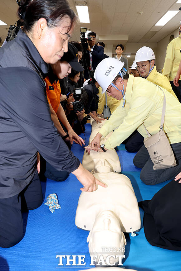 [더팩트ㅣ임영무 기자] 김민석 국무총리가 20일 오후 서울 종로구 정부서울청사에서 열린 을지연습 연계 정부서울청사 공습대비 민방위 훈련에 참가해 심폐소생술(CPR)을 하고 있다.