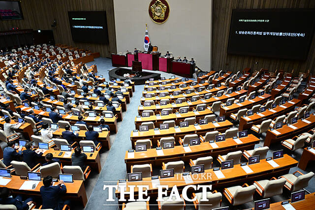 [더팩트ㅣ국회=남윤호 기자] 21일 오전 서울 여의도 국회에서 열린 본회의에서 방송문화진흥회법 일부개정법률안이 재석 171인 중 찬성 169인, 반대 1인, 기권 1인으로 가결되고 있다. '방송 3법'에 반대한 국민의힘 소속 의원들은 표결에 참여하지 않았다.