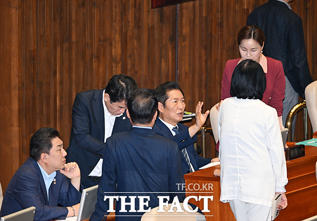 [더팩트ㅣ국회=배정한 기자] 정청래 더불어민주당 대표(가운데)가 21일 오전 서울 여의도 국회에서 열린 본회의에 참석해 의원들과 대화를 하고 있다.