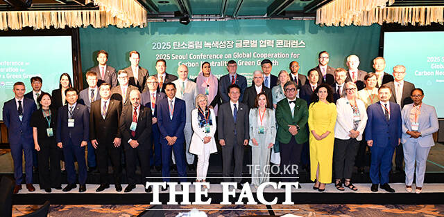 [더팩트ㅣ임영무 기자] 김민석 국무총리(오른쪽 일곱 번째)가 22일 오전 서울 포시즌스 호텔에서 열린 2025 탄소중립 녹색성장 글로벌 협력 콘퍼런스 개회식에 참석해 참석자들과 기념촬영을 하고 있다.darkroom@tf.co.kr사진영상기획부 photo@tf.co.kr