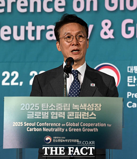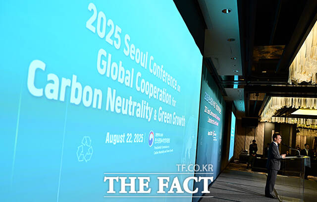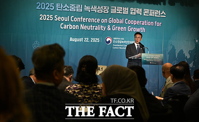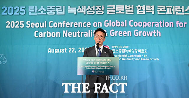 [더팩트ㅣ임영무 기자] 김민석 국무총리가 22일 오전 서울 포시즌스 호텔에서 열린 2025 탄소중립 녹색성장 글로벌 협력 콘퍼런스 개회식에 참석해 개회사를 하고 있다.