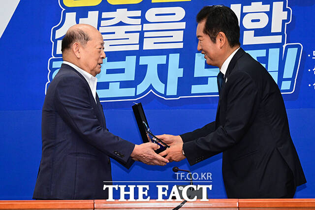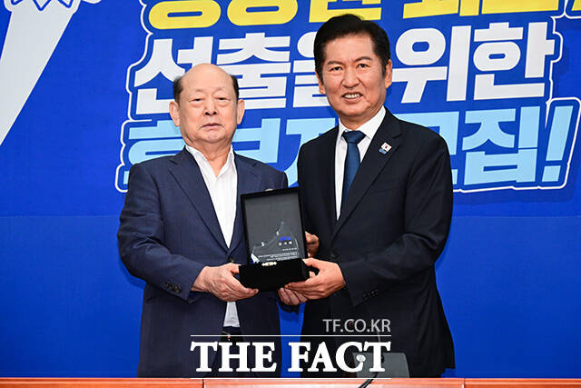 [더팩트ㅣ국회=남윤호 기자] 정청래 더불어민주당 대표가 22일 서울 여의도 국회에서 윤석열 전 대통령 국회 탄핵소추단 법률대리인단 송두환 전 국가인권위원장에게 감사패를 전달하고 있다.
