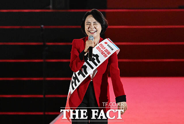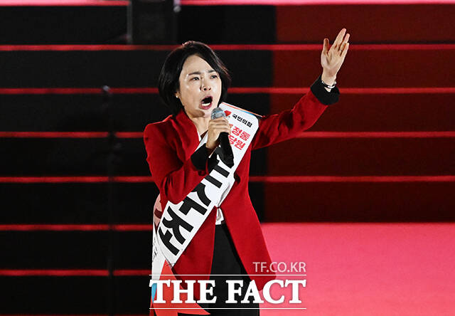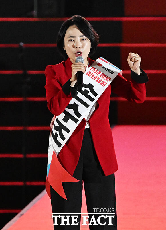 [더팩트ㅣ청주=배정한 기자] 손수조 국민의힘 청년최고위원 후보가 22일 오후 충북 청주시 오스코에서 열린 국민의힘 제6차 전당대회에 참석해 비전 발표를 하고 있다.