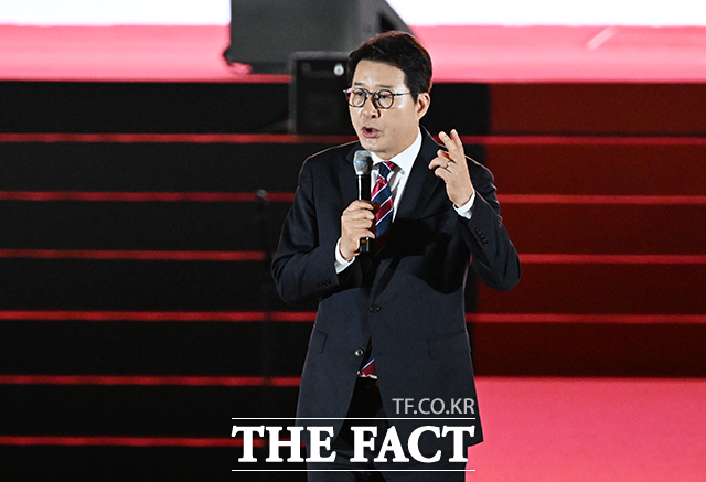 [더팩트ㅣ청주=배정한 기자] 신동욱 국민의힘 최고위원 후보가 22일 오후 충북 청주시 오스코에서 열린 국민의힘 제6차 전당대회에 참석해 비전 발표를 하고 있다.