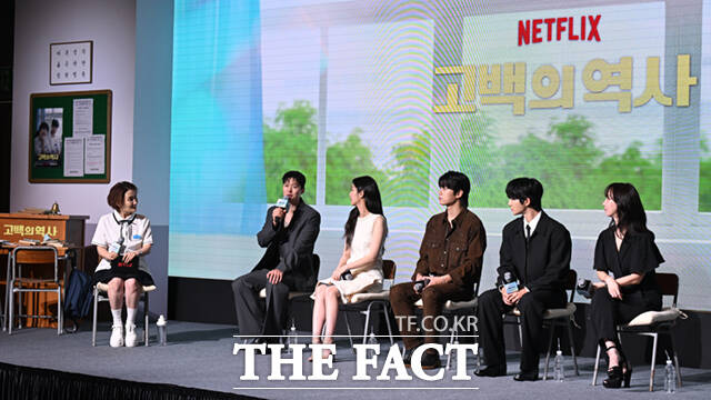 [더팩트ㅣ이새롬 기자] 배우 공명과 신은수, 남궁선 감독, 차우민, 윤상현(왼쪽부터)이 25일 서울 마포구 호텔 나루 서울 엠갤러리에서 열린 넷플릭스 영화 '고백의 역사' 제작발표회에 참석해 포즈를 취하고 있다.