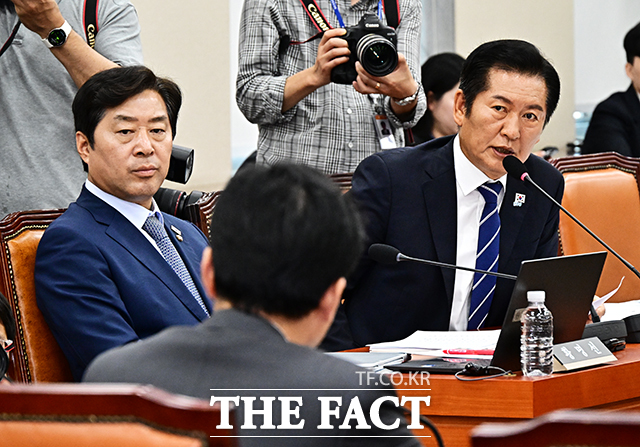 [더팩트ㅣ국회=배정한 기자] 정청래 더불어민주당 대표(오른쪽)가 25일 오후 서울 여의도 국회에서 열린 국방위원회 전체회의에 참석해 질의를 하고 있다.