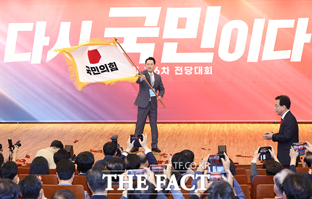 [더팩트ㅣ국회=배정한 기자] 장동혁 국민의힘 신임 당 대표가 26일 오전 서울 여의도 국회 도서관에서 열린 제6차 전당대회 결선에 참석해 당기를 흔들고 있다. hany@tf.co.kr 사진영상기획부 photo@tf.co.kr