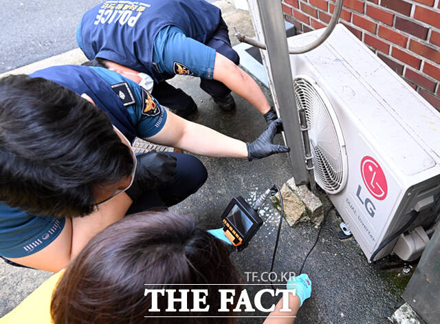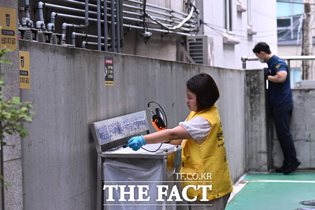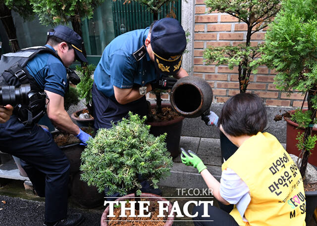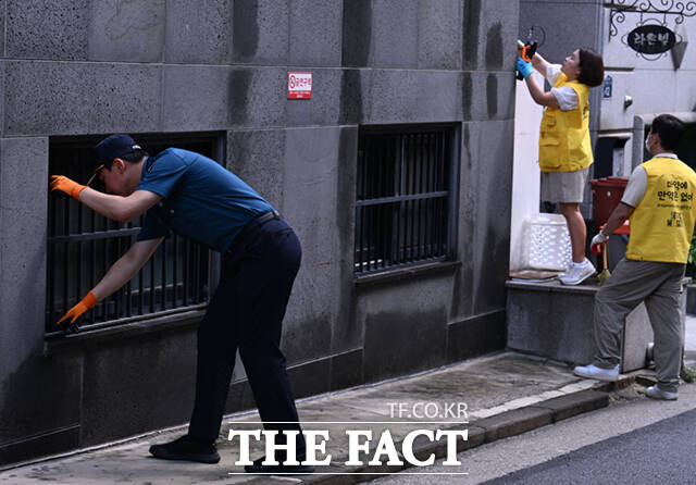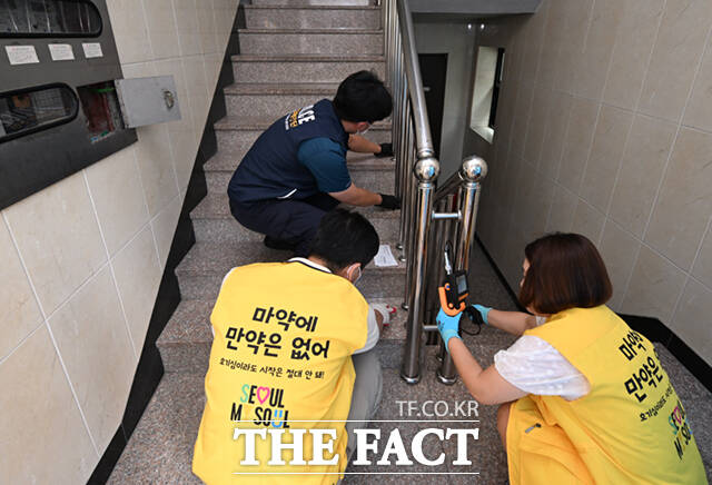 [더팩트ㅣ이새롬 기자] 서울시와 동대문경찰서, 한국외국어대학교, 동대문보건소 등 관계자들로 구성된 합동점검반이 26일 서울 동대문구 이문동 일대 주택가에서 경찰 관계자들이 '마약 던지기' 집중 단속을 하고 있다.