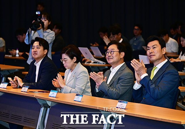 [더팩트ㅣ배정한 기자] 김상규 더팩트 대표이사와 박범계 더불어민주당 의원, 김정재 국민의힘 의원, 이준석 개혁신당 대표(오른쪽부터)가 26일 오후 서울 여의도 중소기업중앙회에서 열린 '제1회 더팩트미래전략포럼'에 참석하고 있다.
