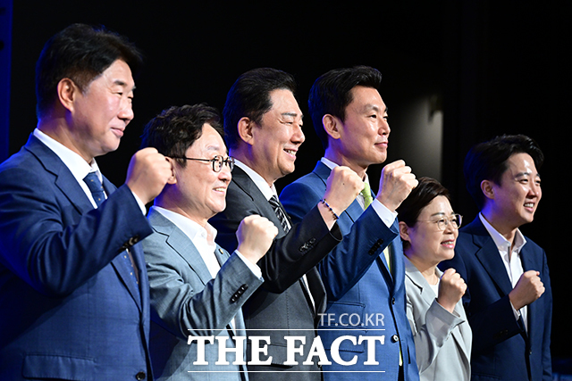 [더팩트ㅣ남윤호 기자] 김상규 더팩트 대표이사와 내빈들이 26일 오후 서울 여의도 중소기업중앙회에서 열린 '제1회 더팩트미래전략포럼'에서 기념촬영을 하고 있다. 왼쪽부터 더불어민주당 이기헌, 박범계 의원, 김병기 원내대표, 김상규 대표, 김정재 국민의힘 의원, 이준석 개혁신당 대표.