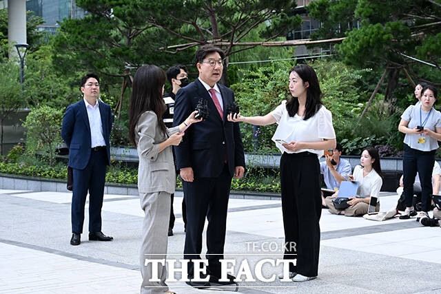 [더팩트ㅣ서예원 기자] 권성동 국민의힘 의원이 27일 오전 서울 종로구 KT광화문빌딩 웨스트에 마련된 민중기 특검 사무실에 출석하며 입장을 밝히고 있다.