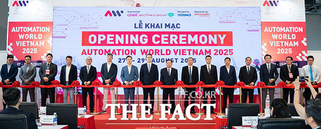 [더팩트ㅣ서예원 기자] 27일 오전(현지시간) 베트남 빈증무역센터 전시장에서 '제2회 베트남 스마트공장·자동화산업전' 개막식에 권태한 주호치민 대한민국 총영사관 부총영사, 김한주 코엑스 전시컨벤션사업본부장, 최병남 스마트제조혁신추진단 본부장, 하 반 윳 호치민시 산업통상국 부국장, 응우옌 홍 베카맥스 회장 등 양국의 주요 인사들이 참여한 가운데 기념 사진을 촬영하고 있다.