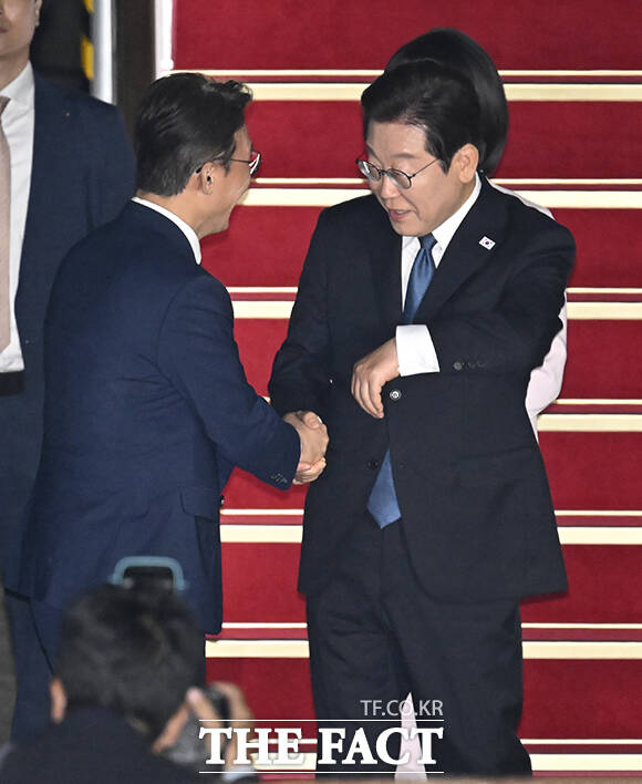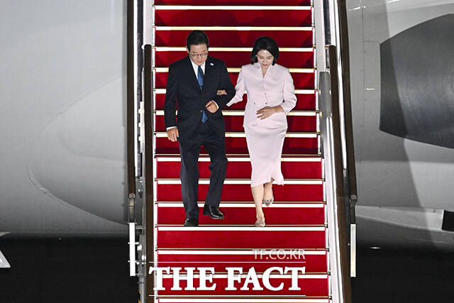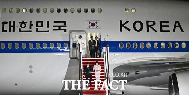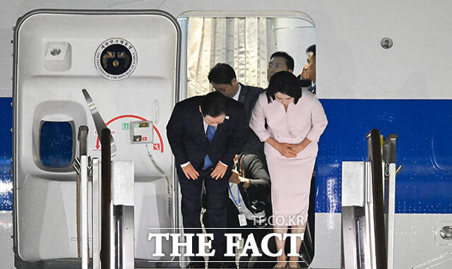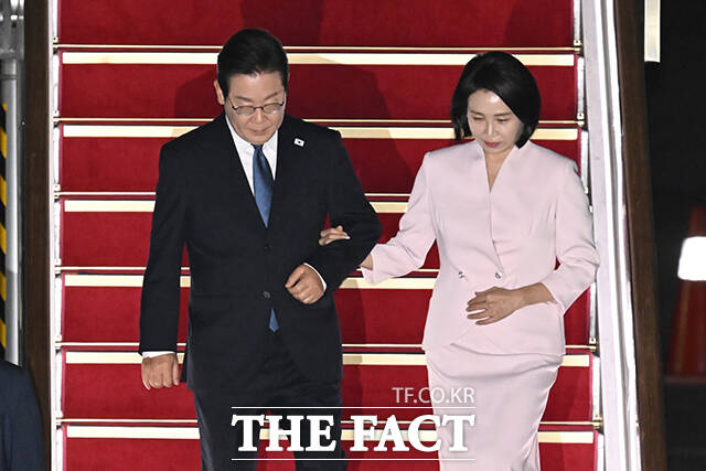 [더팩트ㅣ서울공항=장윤석 기자] 한일·한미 순방 일정을 마친 이재명 대통령과 김혜경 여사가 28일 오전 경기도 성남시 서울공항에 도착해 인사하고 있다.