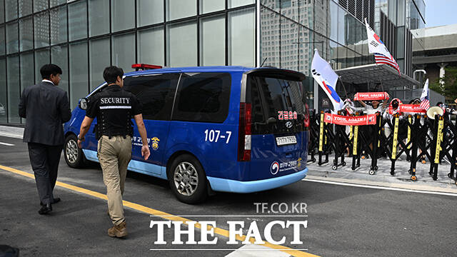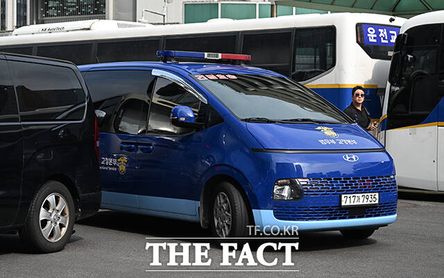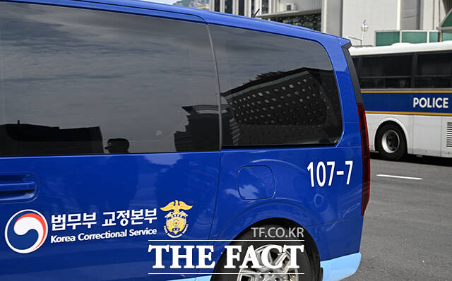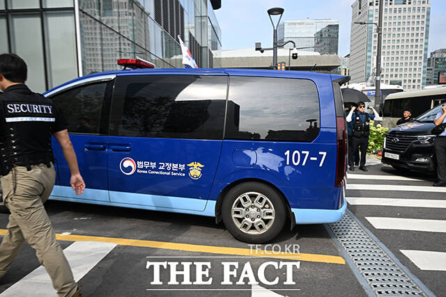 [더팩트ㅣ박헌우 기자] 자본시장법 위반 등 혐의로 구속 수감된 윤석열 전 대통령 부인 김건희 씨가 28일 오전 서울 종로구 KT광화문빌딩 웨스트에 마련된 민중기 특검 사무실에 호송차를 타고 출석하고 있다.