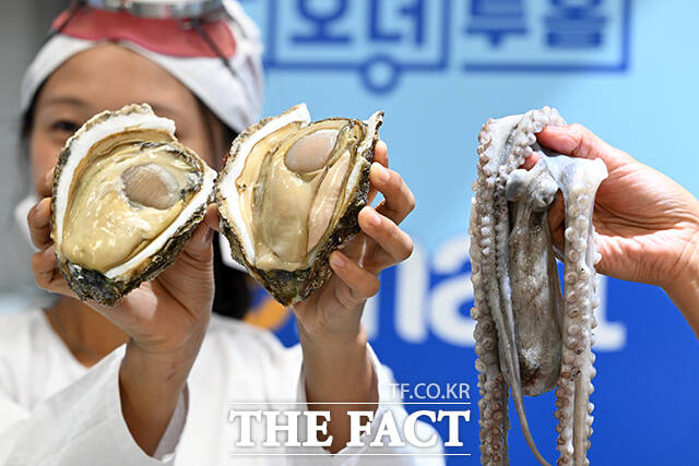 [더팩트ㅣ서예원 기자] 해녀 인플루언서 진소희(왼쪽)와 우정민이 28일 오전 서울 용산구 이마트 용산점에서 직접 잡아올린 수산물을 소개하고 있다.
