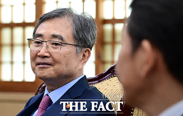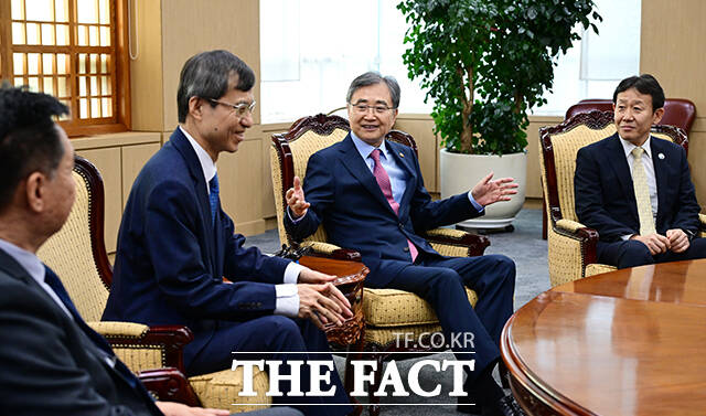 [더팩트ㅣ임영무 기자] 조현 외교부 장관이 3일 오전 서울 종로구 외교부에서 열린 한일중 3국협력사무국(TCS) 사무총장단 접견에 참석해 이희섭 사무총장, 즈시 슈우지 사무차장, 옌 량 사무차장과 환담을 나누고 있다.