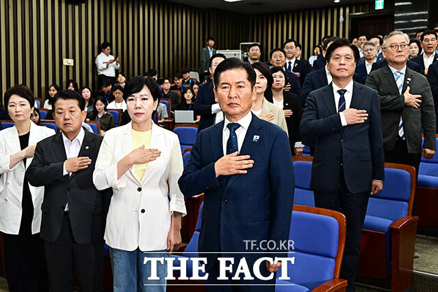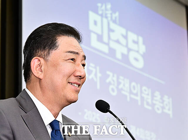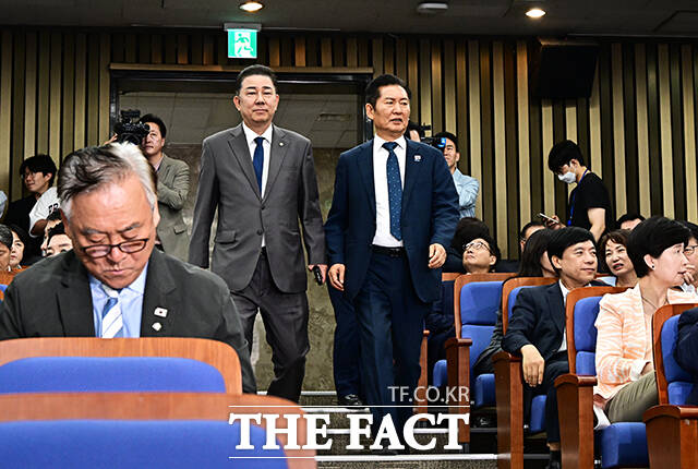 [더팩트ㅣ국회=배정한 기자] 정청래 더불어민주당 대표와 김병기 원내대표(왼쪽)가 3일 오후 서울 여의도 국회에서 열린 정책의원총회에 참석하고 있다.