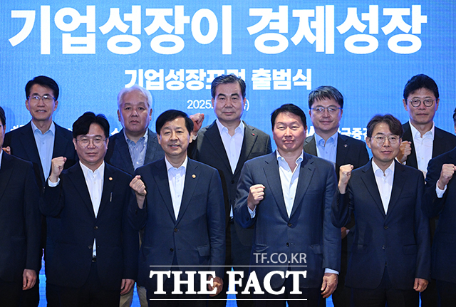[더팩트ㅣ박헌우 기자] '기업성장포럼 출범식'이 4일 오전 서울 중구 롯데호텔 서울에서 열린 가운데 구윤철 부총리 겸 기획재정부 장관과 최태원 대한상공회의소 회장 등 참석자들이 기념촬영을 하고 있다.