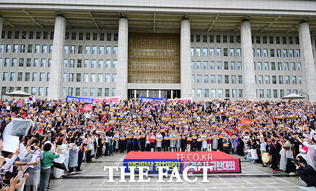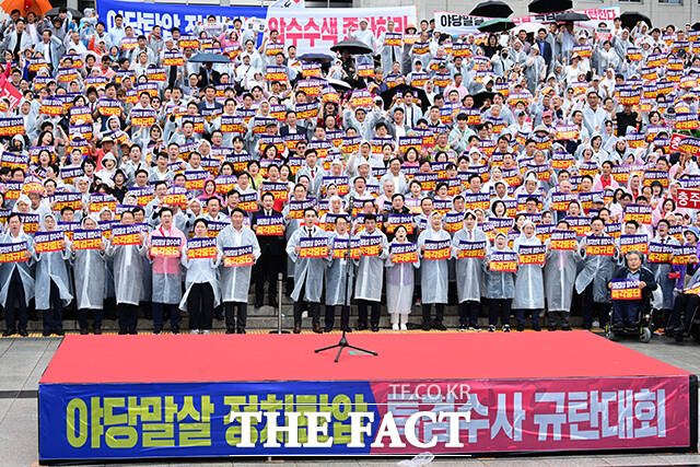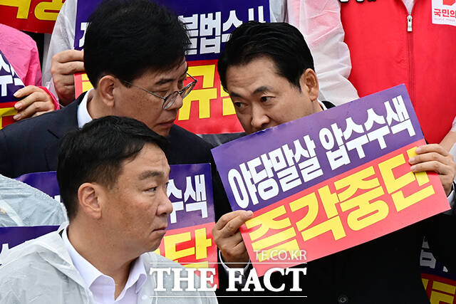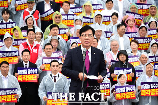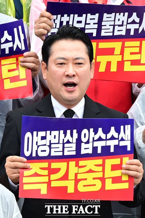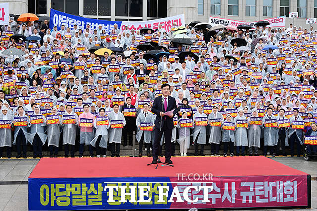 [더팩트ㅣ국회=남윤호 기자] 장동혁 국민의힘 대표가 4일 오전 서울 여의도 국회 본관 앞에서 열린 '야당말살 정치탄압 특검수사 규탄대회'에 참석해 규탄사를 하고 있다.