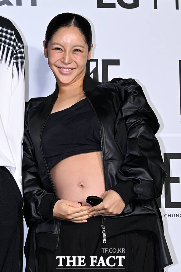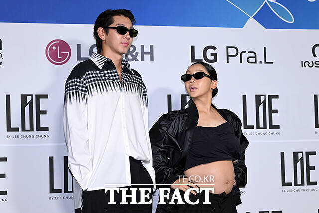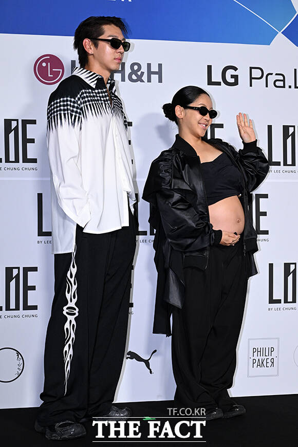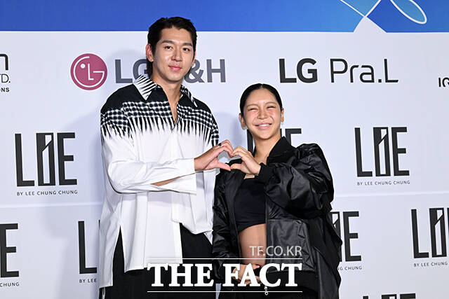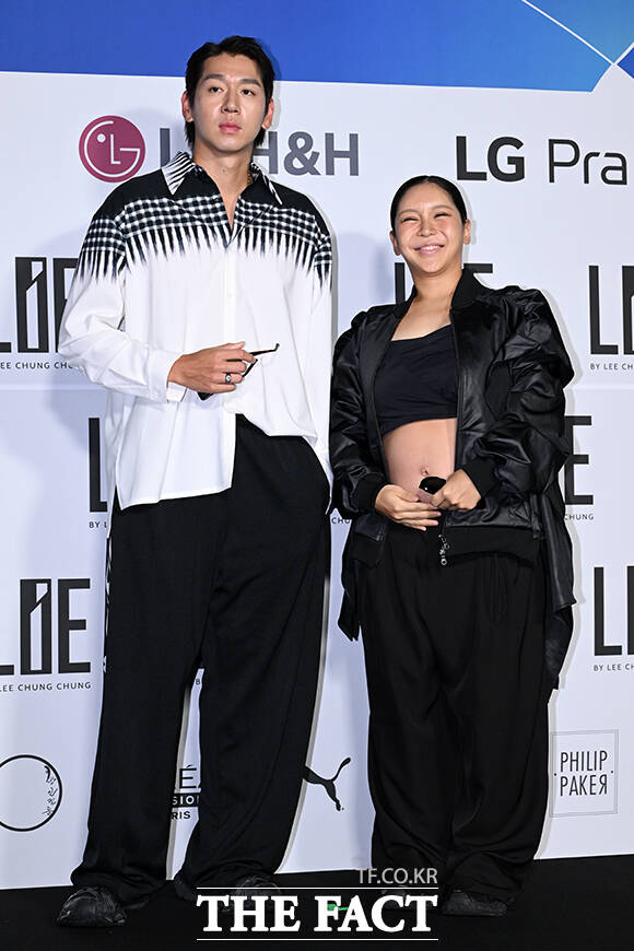 [더팩트ㅣ서예원 기자] 전 야구선수 이대은(왼쪽)과 가수 트루디 부부가 4일 오전 서울 중구 동대문디자인플라자(DDP)에서 열린 2026 S/S 서울패션위크 라이 포토월에 참석해 포즈를 취하고 있다.