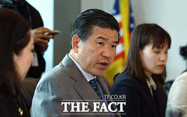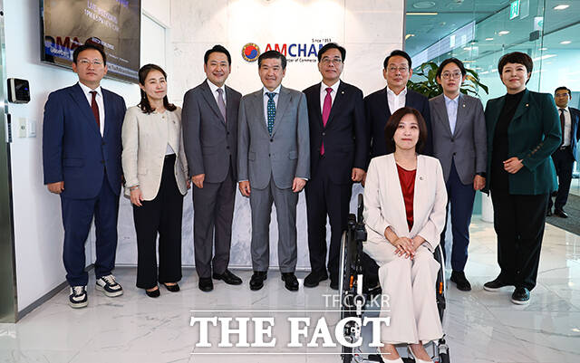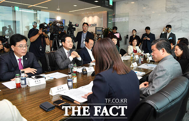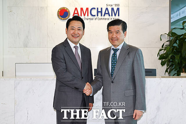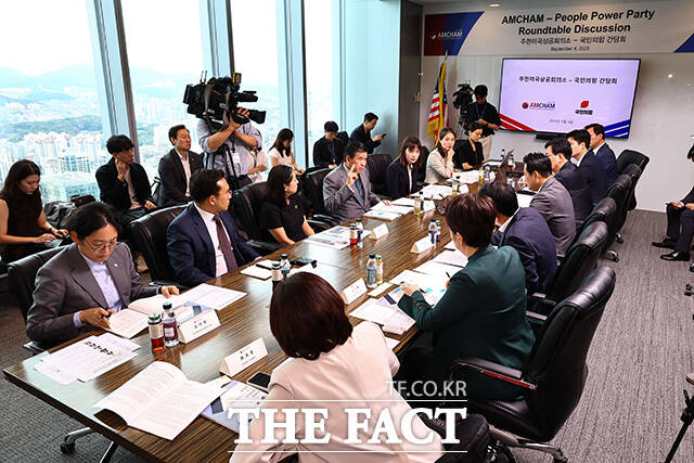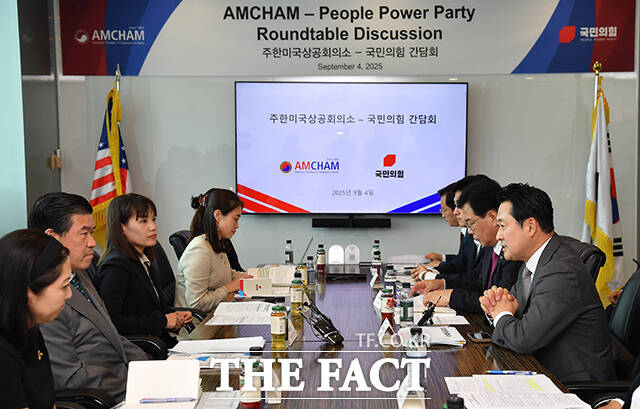[더팩트ㅣ남윤호 기자] 장동혁 국민의힘 대표(왼쪽 두 번째)가 4일 오후 서울 여의도 주한미국상공회의소에서 열린 국민의힘-주한미국상공회의소(AMCHAM) 간담회에서 제임스 김 회장과 만나 발언하고 있다.