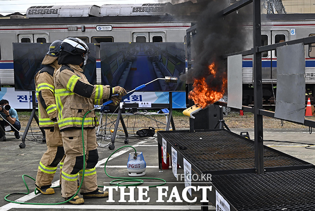 [더팩트ㅣ박헌우 기자] 4일 오후 경기 고양시 지축차량기지에서 '5호선 전동차 방화 관련 화재시연'이 진행 중인 가운데 소방 관계자가 전동차 내장재 6종에 대한 방염 성능 테스트를 하고 있다.