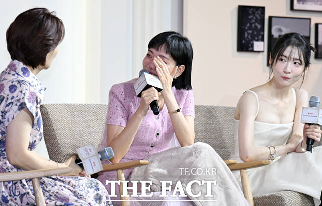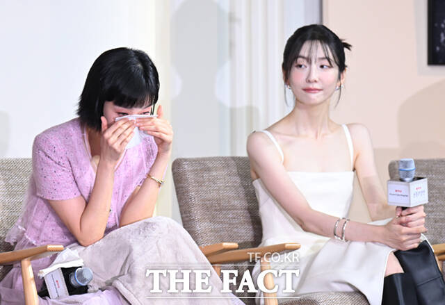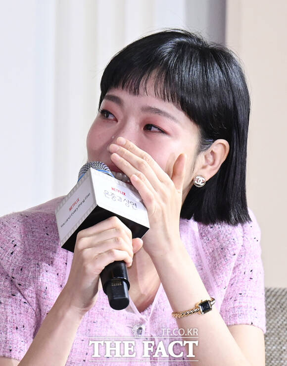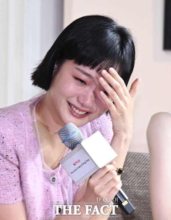 [더팩트ㅣ이새롬 기자] 배우 김고은이 5일 서울 중구 앰배서더 서울 풀만 호텔에서 열린 넷플릭스 새 시리즈 '은중과 상연' 제작발표회에 참석해 극 중 내용을 설명하는 도중 눈물을 흘리고 있다.