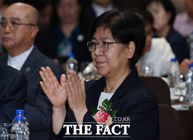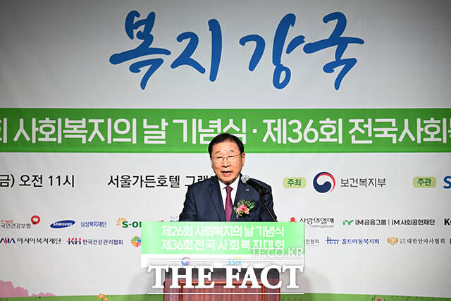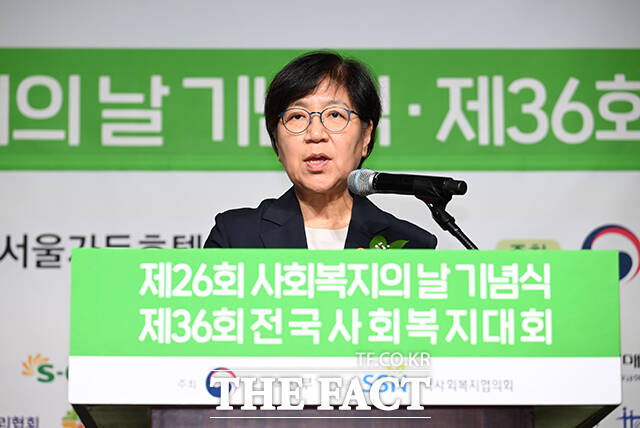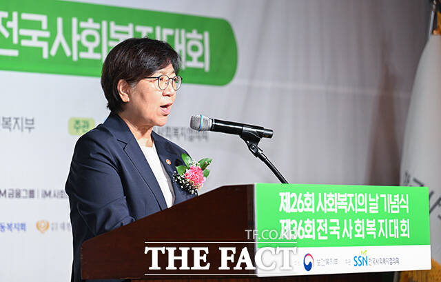 [더팩트ㅣ박헌우 기자] 정은경 보건복지부 장관이 5일 오전 서울 마포구 서울가든호텔에서 열린 '제26회 사회복지의 날 기념식'에 참석해 이재명 대통령의 축사를 대독하고 있다.