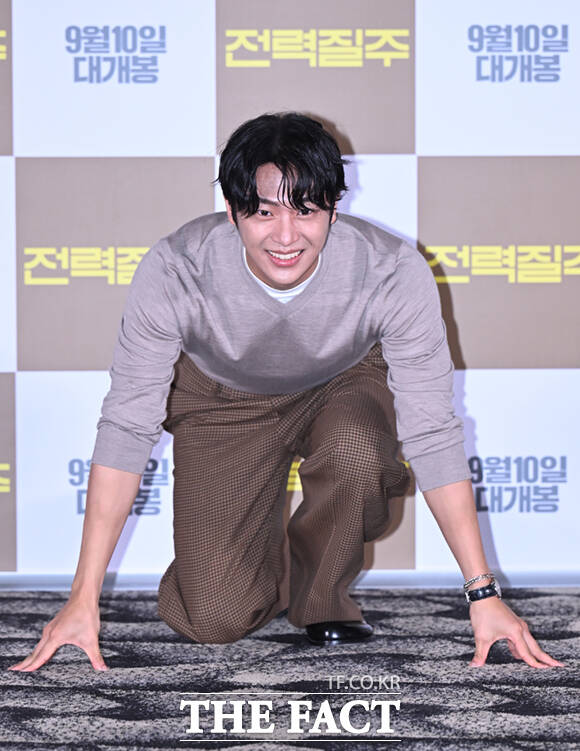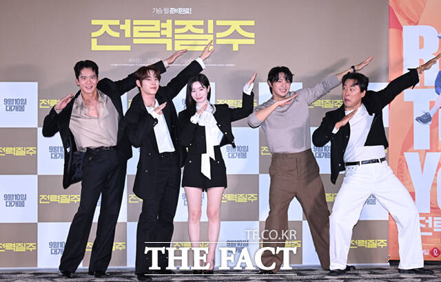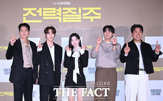 [더팩트ㅣ이새롬 기자] 배우 하석진과 윤서빈, 다현, 이신영, 이순원(왼쪽부터)이 5일 서울 송파구 롯데시네마 월드타워점에서 열린 영화 '전력질주' 언론시사회 및 기자간담회에 참석해 포즈를 취하고 있다.