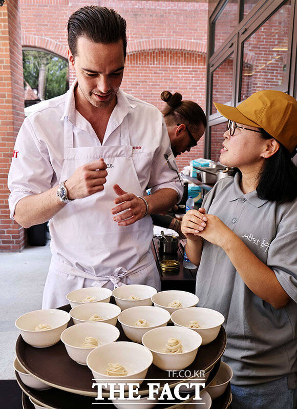 미슐랭 3스타 셰프 크리스티안 스툽과 이야기 나누는 거창한국수 김상희 대표 [포토]