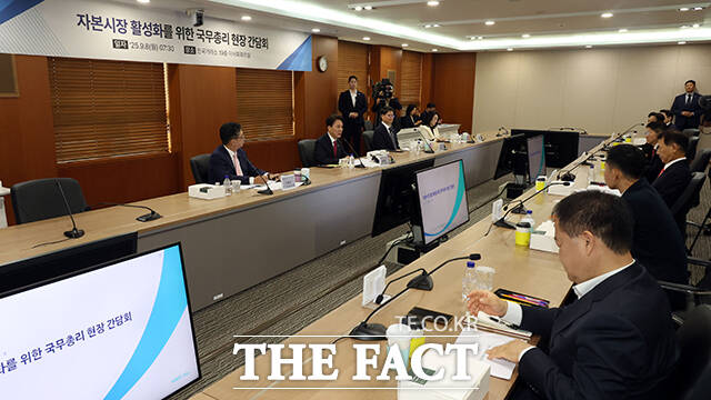 [더팩트ㅣ임영무 기자] 김민석 국무총리가 8일 오전 서울 여의도 한국거래소에서 열린 자본시장 활성화를 위한 현장 간담회에 참석해 정은보 한국거래소 이사장 및 참석자들과 대화를 나누고 있다.