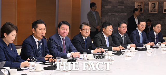 [더팩트ㅣ이새롬 기자] 정청래 더불어민주당 대표(왼쪽 두 번째)가 8일 서울 중구 대한상공회의소에서 열린 대한상의와의 정책 간담회에 참석해 발언하고 있다.