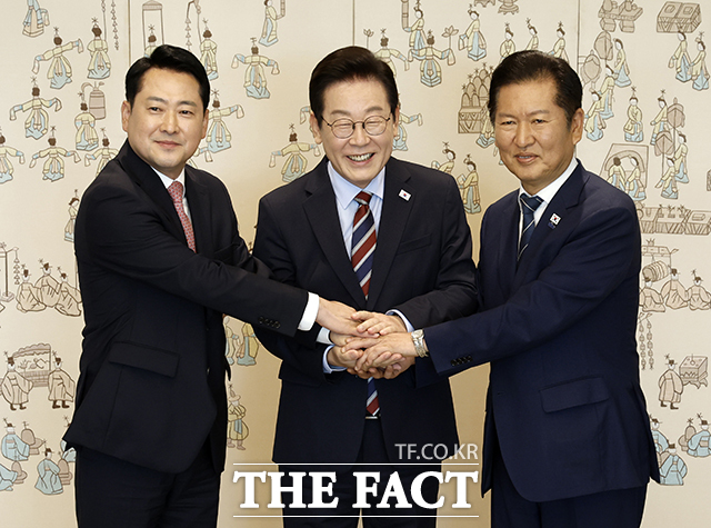 [더팩트ㅣ장윤석 기자] 이재명 대통령이 8일 오후 서울 용산구 대통령실 청사에서 열린 여야 지도부 오찬 회동에 앞서 정청래 더불어민주당 대표(왼쪽)와 장동혁 국민의힘 대표의 악수 모습을 보며 밝게 웃고 있다.