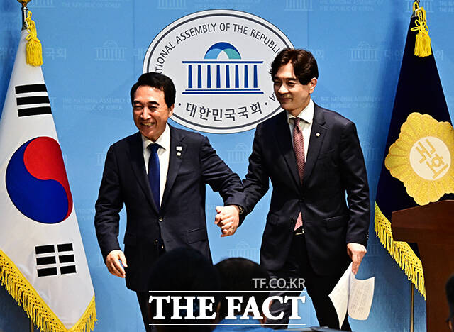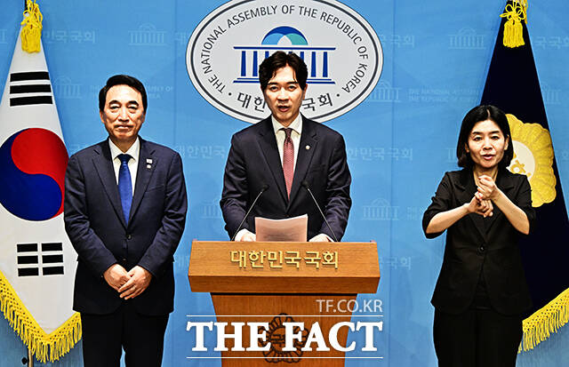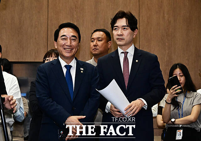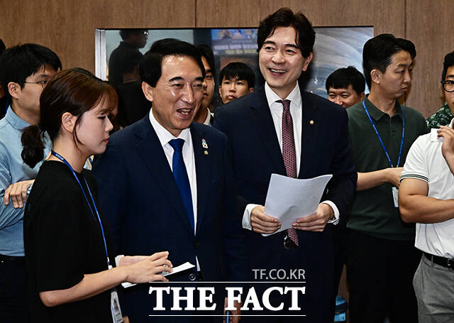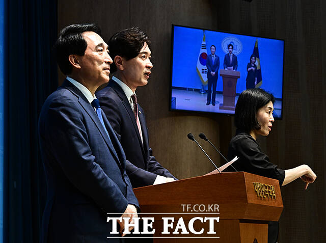 [더팩트ㅣ국회=배정한 기자] 박수현 더불어민주당 수석대변인과 박성훈 국민의힘 수석대변인이 8일 오후 서울 여의도 국회 소통관에서 '대통령-여야 당대표 회동 결과 공동 브리핑'을 하고 있다.
