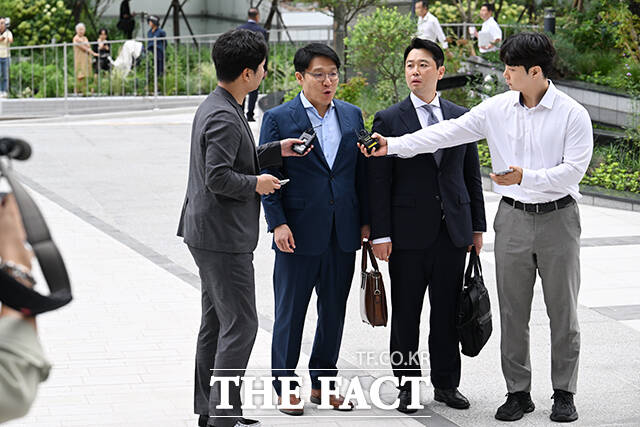 [더팩트ㅣ박헌우 기자] '공천개입 의혹'을 받는 김상민 전 부장검사가 9일 오전 서울 종로구 KT광화문빌딩 웨스트에 마련된 김건희특검 사무실로 출석하며 입장을 밝히고 있다.