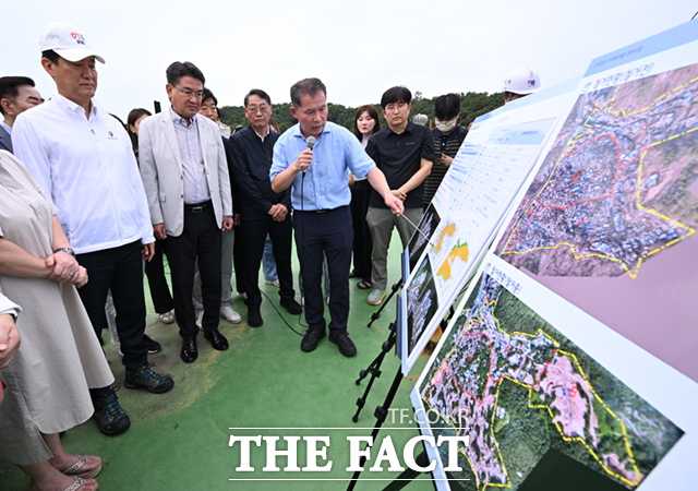 [더팩트ㅣ이새롬 기자] 오세훈 서울시장(왼쪽)과 오승록 노원구청장이 9일 서울 노원구 중계동 백사마을(노원구 중계본동 30-3번지 일대)을 방문해 사업현황을 보고받고 있다.