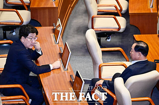 [더팩트ㅣ국회=배정한 기자] 불법 정치자금 수수 혐의로 구속 영장이 청구된 권성동 국민의힘 의원이 9일 오전 서울 여의도 국회에서 열린 본회의에 참석해 자신의 체포동의안 보고를 지켜보고 있다.