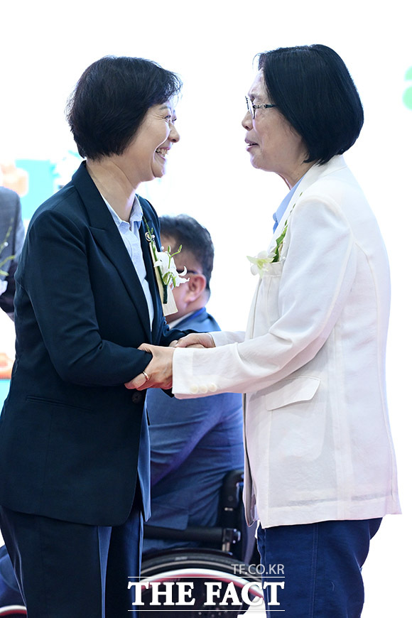 [더팩트ㅣ남용희 기자] 이스란 보건복지부 제1차관(왼쪽)과 이경혜 한국장애인개발원 원장이 9일 오후 서울 서초구 AT센터에서 열린 '2025년 중증장애인생산품 박람회 개막식'에서 인사를 나누고 있다.