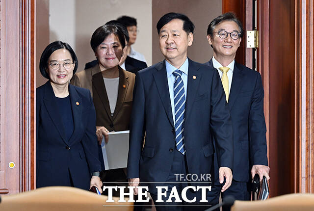 [더팩트ㅣ임영무 기자] 구윤철 부총리 겸 기획재정부 장관(가운데)과 송미령 농림축산식품부 장관, 전재수 해양수산부 장관, 한성숙 중소벤처기업부 장관이 10일 오전 서울 종로구 정부서울청사에서 열린 성정전략TF 겸 산업경쟁력강화 관계장관회의에 참석하고 있다.