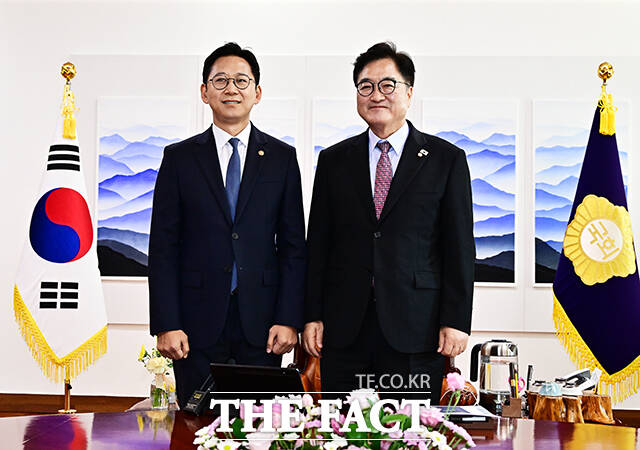 [더팩트ㅣ국회=배정한 기자] 우원식 국회의장이 10일 오전 서울 여의도 국회에서 배경훈 과학기술정보통신부 장관(왼쪽)을 접견하며 기념사진 촬영을 하고 있다.