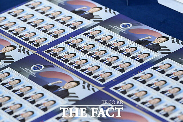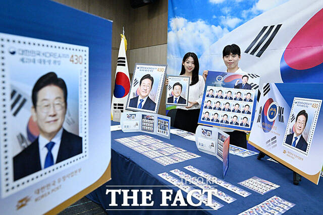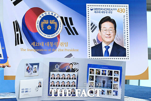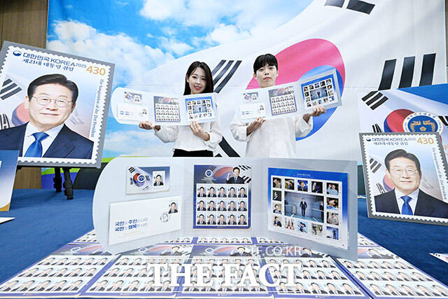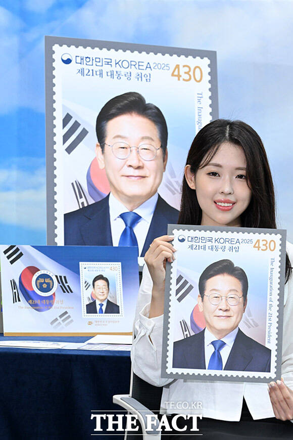[더팩트ㅣ남용희 기자] 이재명 대통령 취임 100일을 하루 앞둔 10일 오전 서울 중구 여의도우체국 포스트타워에서 모델들이 '제21대 대통령 취임' 기념우표를 선보이고 있다.