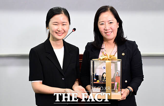 [더팩트ㅣ임영무 기자] 신영숙 여성가족부 차관(오른쪽)이 10일 오전 서울 종로구 정부서울청사에서 열린 이임식에 참석해 직원들로부터 피규어 선물을 받은 뒤 기념촬영을 하고 있다.