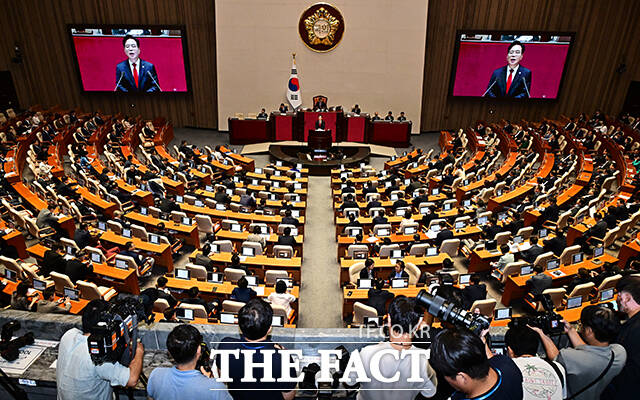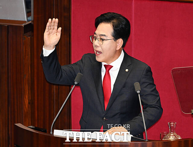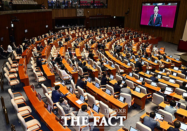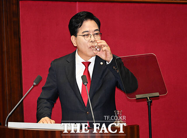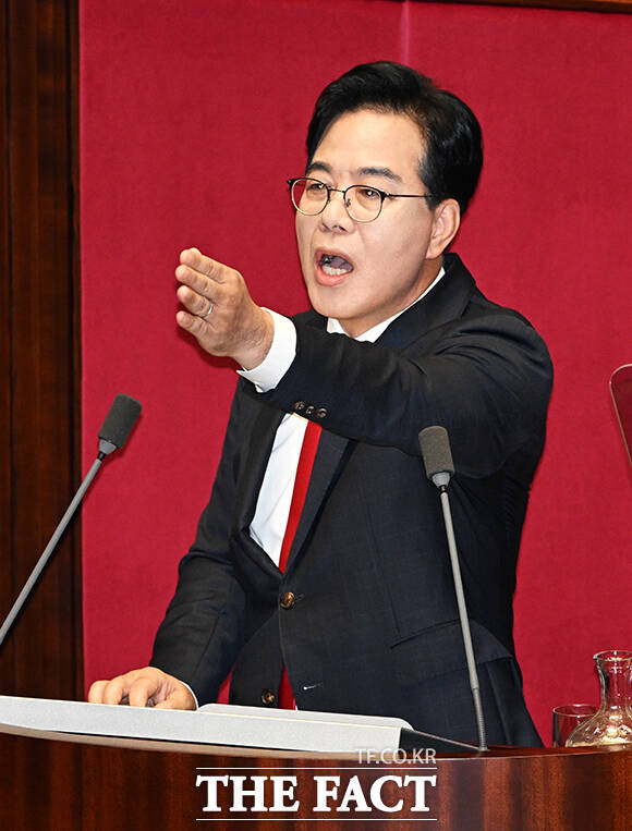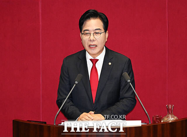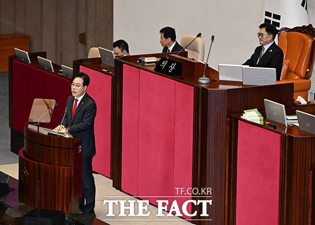 [더팩트ㅣ국회=배정한 기자] 송언석 국민의힘 원내대표가 10일 오전 서울 여의도 국회에서 열린 본회의에 참석해 교섭단체 대표 연설을 하고 있다.