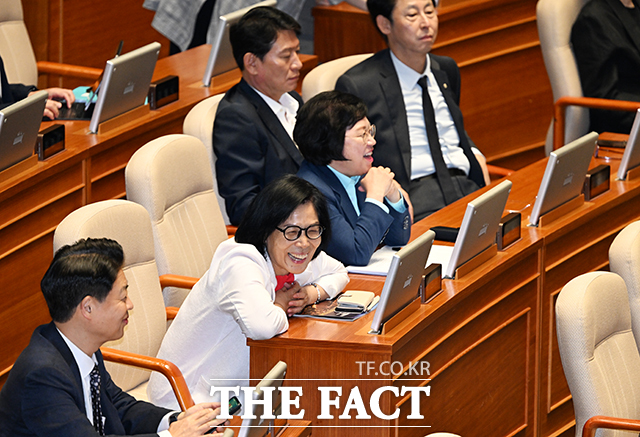 [더팩트ㅣ국회=배정한 기자] 최민희 더불어민주당 의원(왼쪽 두번째)과 김현 의원(가운데)이 10일 오전 서울 여의도 국회에서 열린 본회의에 참석해 송언석 원내대표의 교섭단체 대표 연설을 들으며 환한 미소를 짓고 있다.hany@tf.co.kr사진영상기획부 photo@tf.co.kr